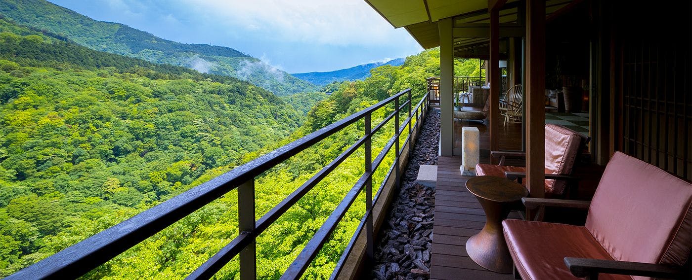 箱根吟遊は、全室に客室露天風呂が設けられ、壮大な箱根連山を一望できるラグジュアリーな宿。